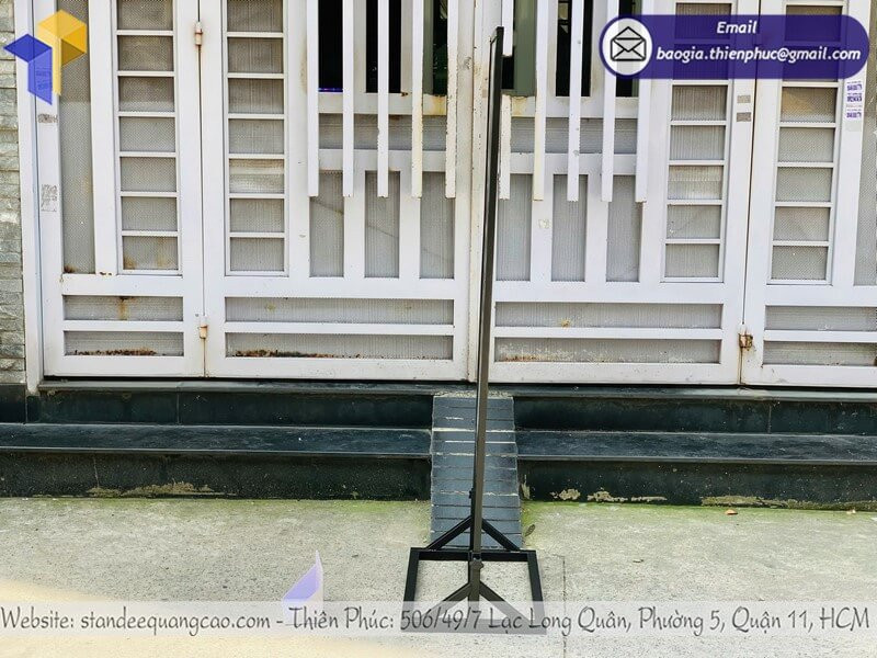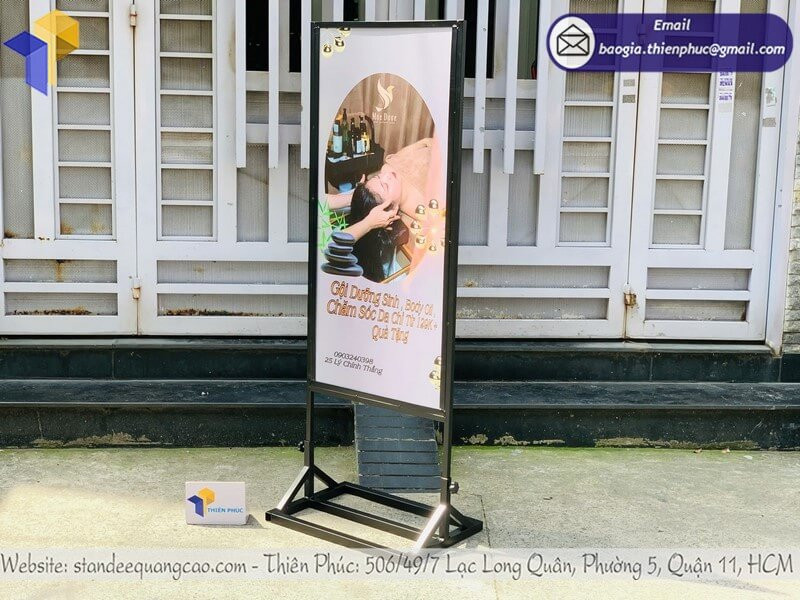 Đối với môi trường quảng cáo ngoài trời, loại bảng hiệu đứng 2 mặt chống nước và chống gió là giải pháp phù hợp. Bảng được thiết kế bằng khung sắt dày, phủ sơn tĩnh điện, kết hợp chân đế có đối trọng hoặc bánh xe để cố định vững chắc. Đây là lựa chọn tốt nếu bạn cần sử dụng lâu dài trước cửa hàng ngoài trời.