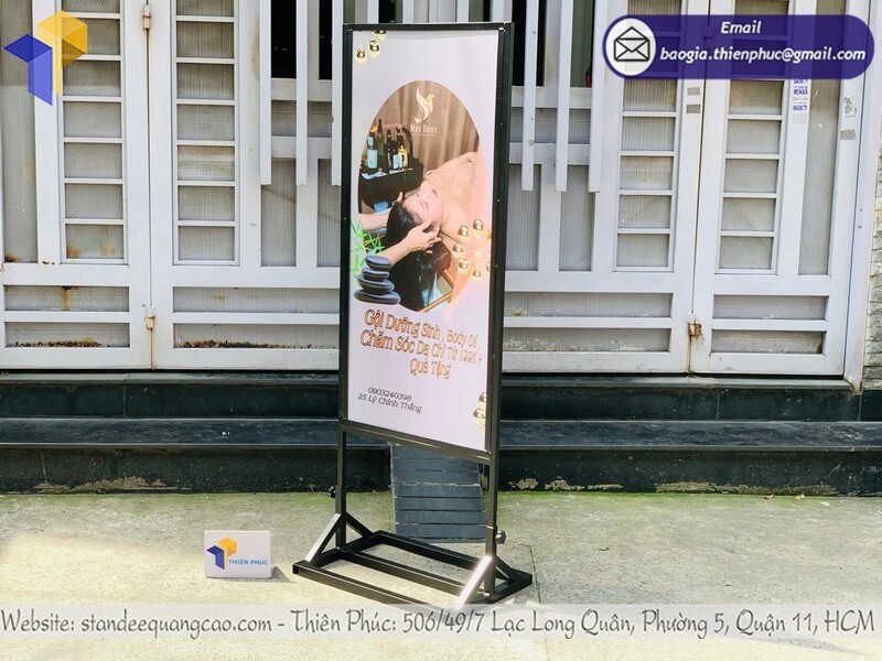 Nhiều spa, salon tóc còn dùng bảng hiệu đứng 2 mặt dạng mica để tăng tính sang trọng cho mặt tiền.