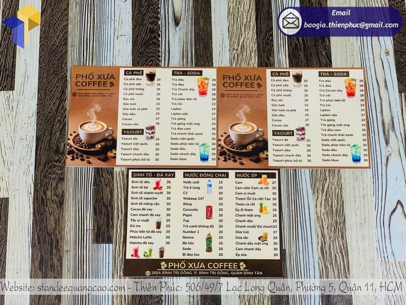 Nhận làm nhanh trong ngày – hỗ trợ thiết kế theo mẫu – phù hợp quán cà phê, quán nước, nhà hàng.