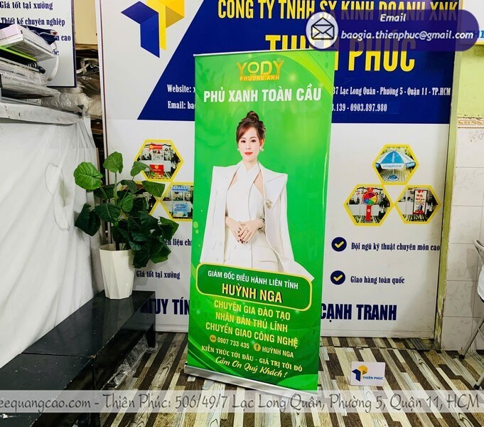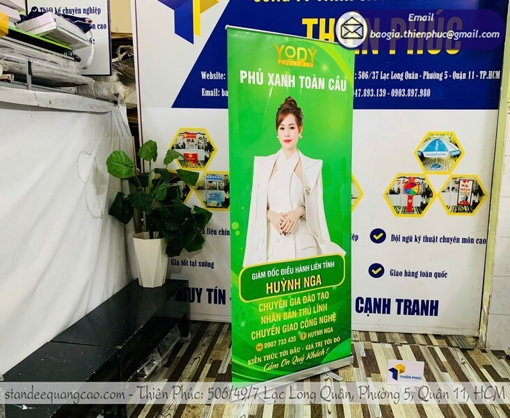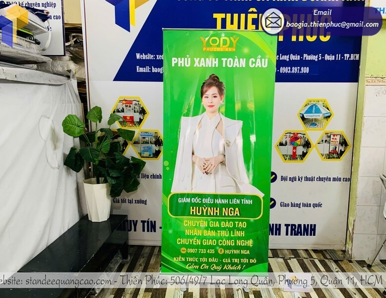 Cuốn nhôm (roll-up) có hộp nhôm bảo vệ, dễ di chuyển và dùng nhiều lần. Khi khách cần giải pháp lâu dài, phần báo giá in standee thường khuyến nghị loại này vì độ bền cao và tính thẩm mỹ tốt.
