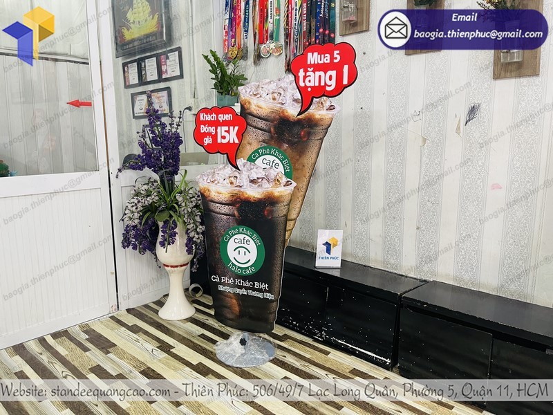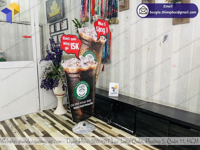 Standee mô hình ly cafe được làm bằng khung sắt được sử dụng ngày càng rộng rã trong quảng cáo và các chương trình sự kiện mang đến hiệu quả cao trong chiến lược quảng bá hình ảnh của các quán trà sữa.