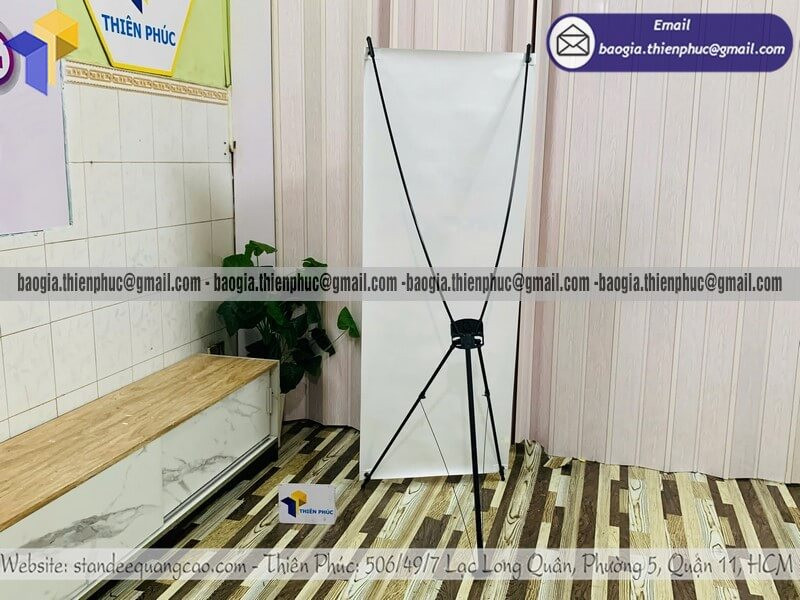 Standee chữ X là dạng khung treo banner có cấu trúc hình chữ X phía sau, dùng để căng bạt in nội dung quảng cáo. Nhờ thiết kế đơn giản, sản phẩm này dễ dàng lắp đặt và tháo gỡ chỉ trong vài phút.