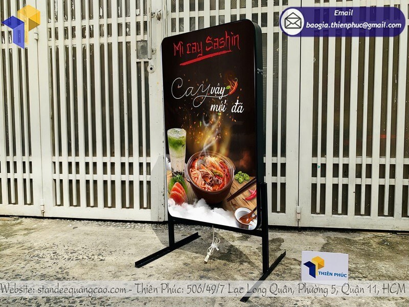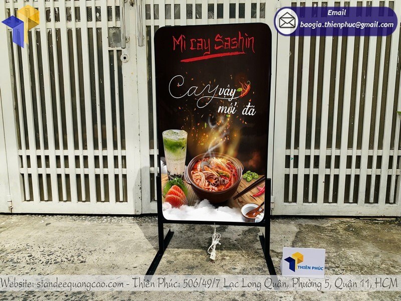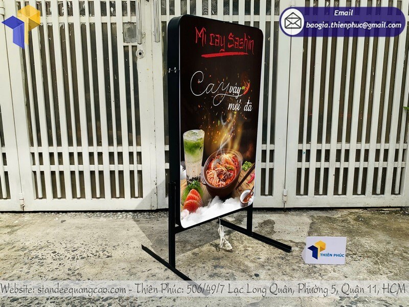 Bảng hiệu hộp đèn đứng có thể đặt trong nhà hoặc ngoài trời, dễ di chuyển và lắp đặt — rất tiện lợi cho các chiến dịch quảng cáo ngắn hạn hoặc dài hạn.