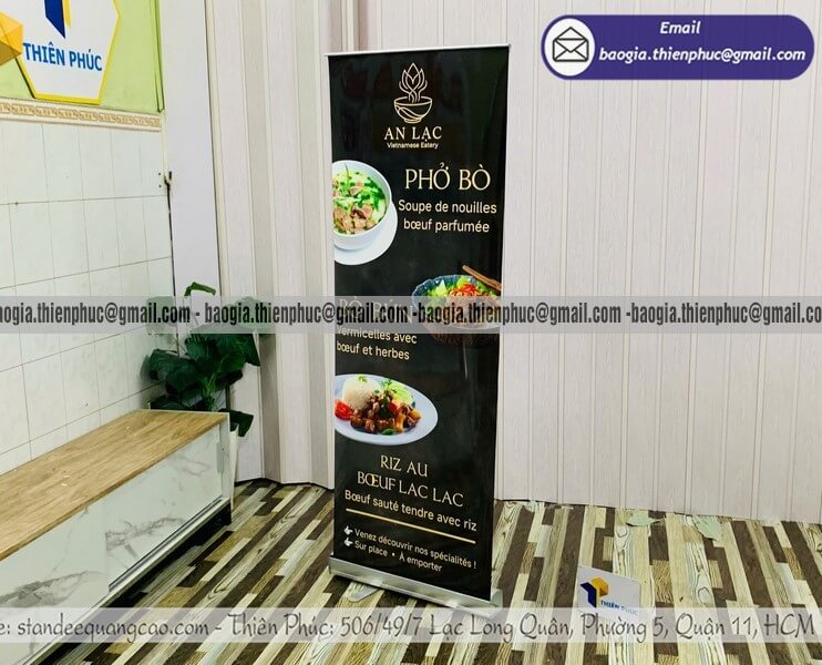 Với thiết kế dạng cuốn gọn trong hộp nhôm, sản phẩm dễ dàng mang theo, lắp đặt nhanh và tái sử dụng nhiều lần. Từ các cửa hàng nhỏ đến sự kiện quy mô lớn, standee đều phát huy tốt vai trò truyền tải thông tin.