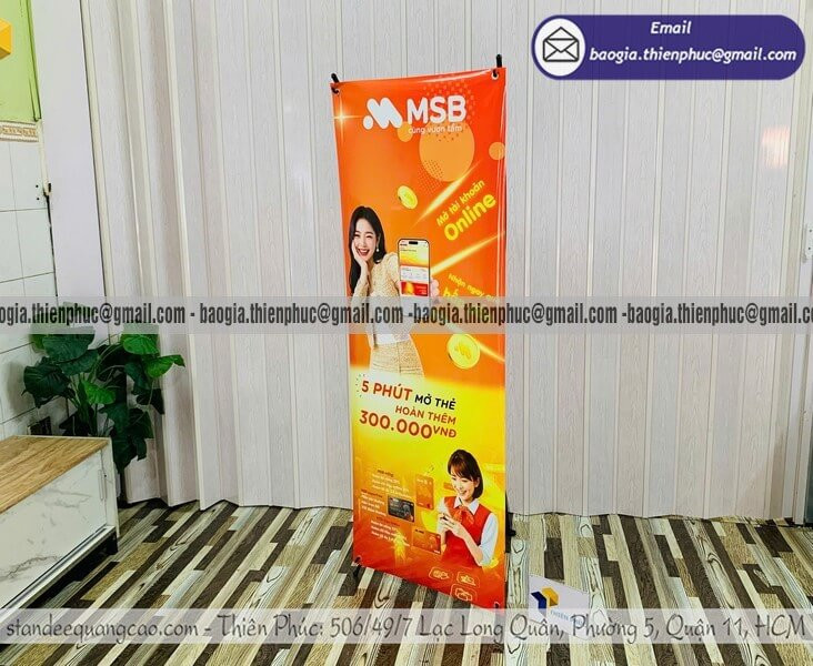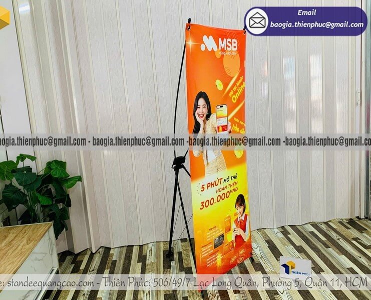 Bước 4 — Lắp ráp khung và kiểm tra thành phẩm Toàn bộ standee được lắp ráp hoàn chỉnh, dựng thử kiểm tra độ căng và thẳng trước khi đóng gói. Bạn nhận standee ở trạng thái sẵn sàng sử dụng ngay, không cần tự lắp ráp tại nơi sự kiện.