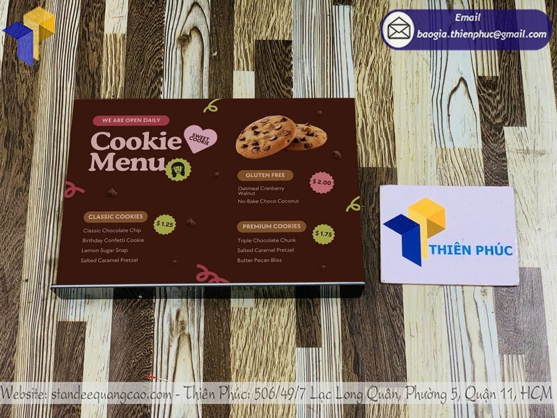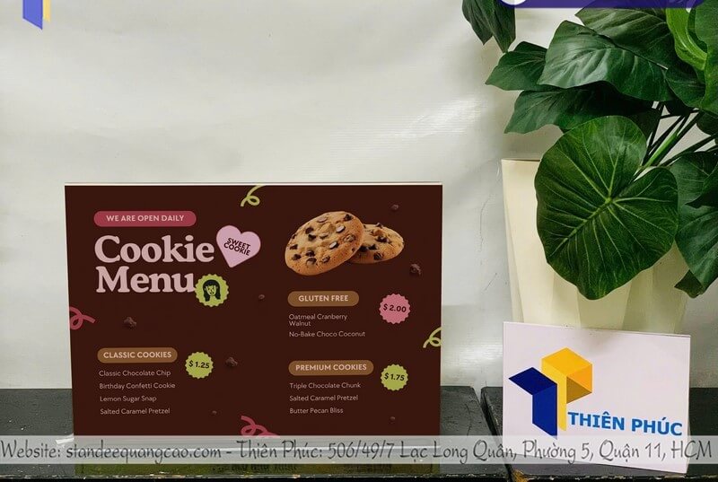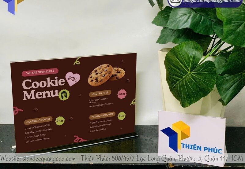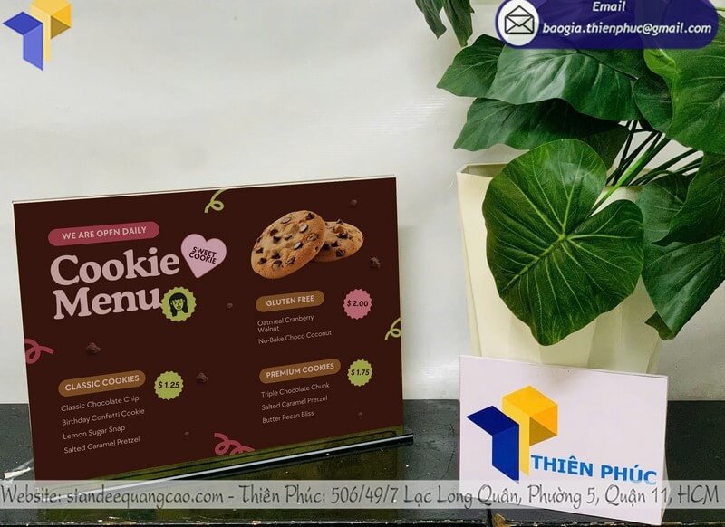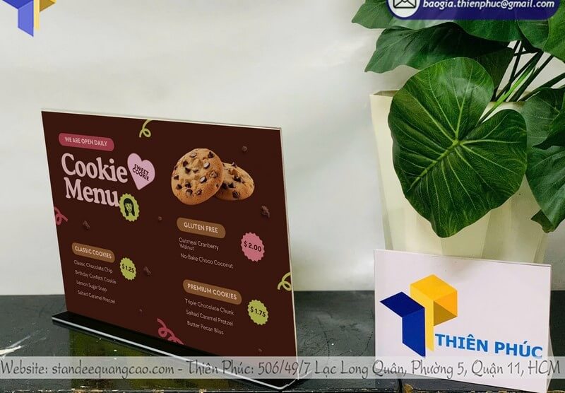 Doanh nghiệp có thể đặt làm bảng menu mica để bàn theo kích thước riêng, độ dày riêng hoặc in logo trực tiếp lên bề mặt. Đây là cách giúp tối ưu nhận diện thương hiệu hiệu quả chỉ với chi phí rất thấp.
