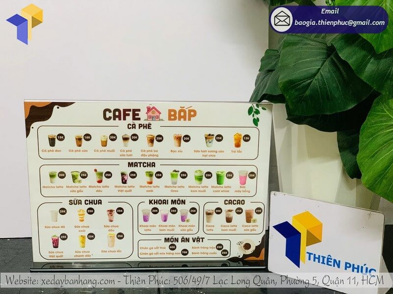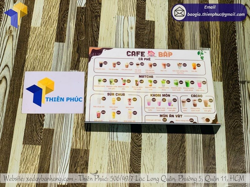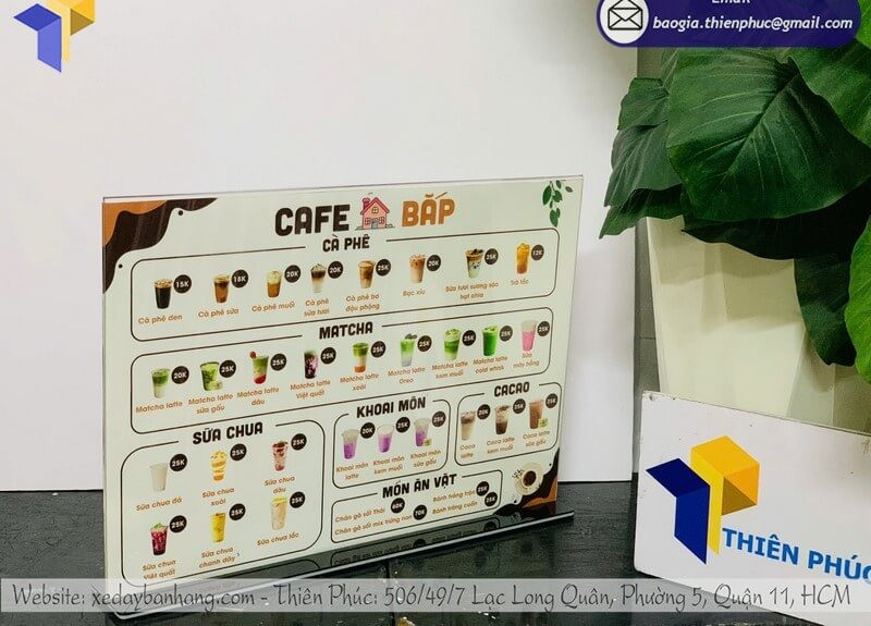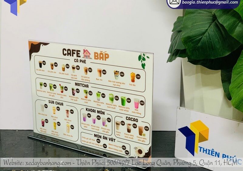 Liên hệ ngay để được tư vấn chọn mẫu menu để bàn mica phù hợp với không gian quán của bạn 0947.893.139 - 0903.897.980.