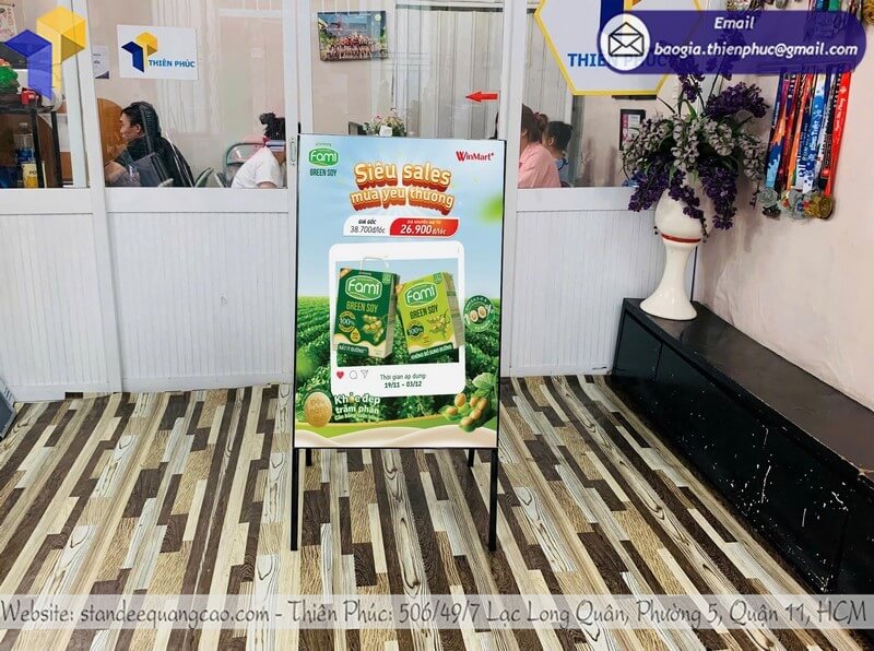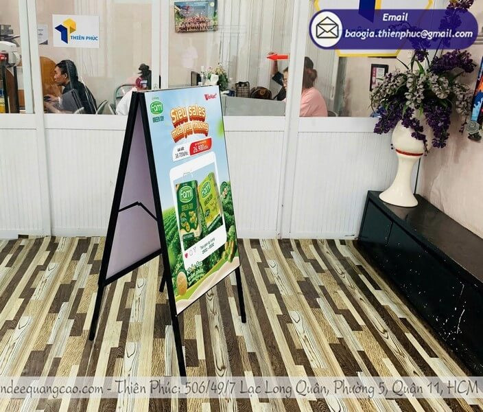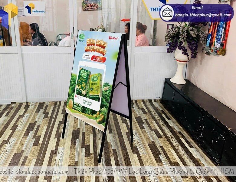 Standee chất lượng không chỉ là công cụ quảng cáo đơn thuần, mà còn thể hiện hình ảnh doanh nghiệp. Standee chân sắt với khung chắc chắn, poster in sắc nét giúp thương hiệu tạo được ấn tượng chuyên nghiệp ngay từ cái nhìn đầu tiên.