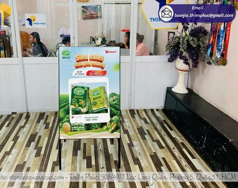 Tại các điểm bán, standee giúp thu hút sự chú ý ngay khi khách bước vào. Việc sử dụng standee chân sắt làm tăng tính chuyên nghiệp và tạo điểm nhấn trực quan tại khu vực trưng bày.
