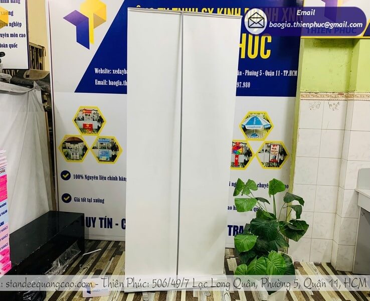 Phần khung của standee được làm từ nhôm nguyên khối cao cấp, vừa nhẹ vừa chắc, mang đến cảm giác sang trọng, hiện đại khi trưng bày. Bề mặt nhôm được anod hóa chống oxy hóa, giúp standee luôn sáng bóng dù sử dụng trong thời gian dài.