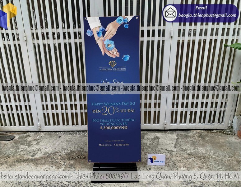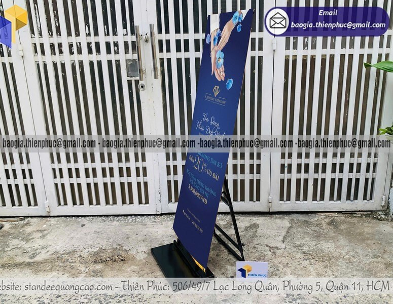 Khung sắt được gia công tỉ mỉ, kết cấu ổn định, giúp standee đứng vững ngay cả trong môi trường đông người hoặc không gian ngoài trời có gió nhẹ.