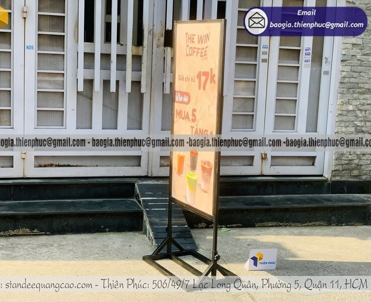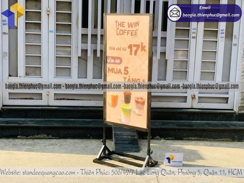 Standee khung sắt đứng 2 mặt cho phép thay poster nhanh chóng, phù hợp cho các chiến dịch quảng cáo ngắn hạn, chương trình khuyến mãi theo mùa hoặc sự kiện định kỳ.