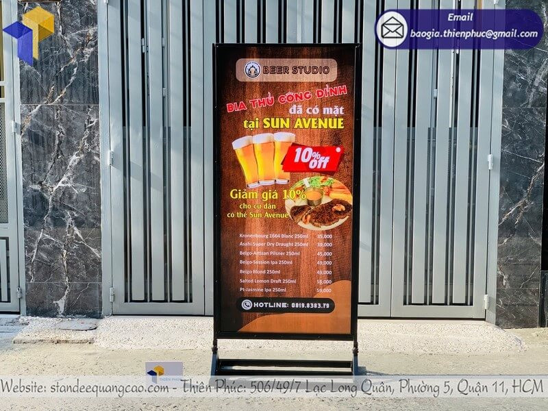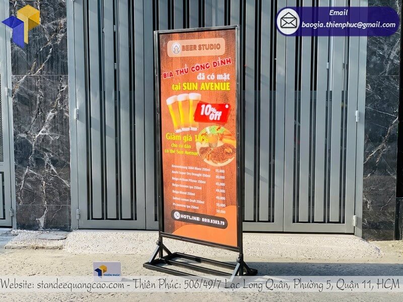 Cuối cùng là hiệu quả trưng bày ổn định. Standee quảng cáo đứng luôn giữ được vị trí rõ ràng trong không gian, giúp thông điệp tiếp cận trực tiếp với khách hàng ngay từ ánh nhìn đầu tiên.