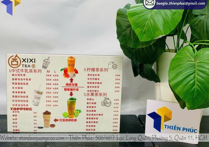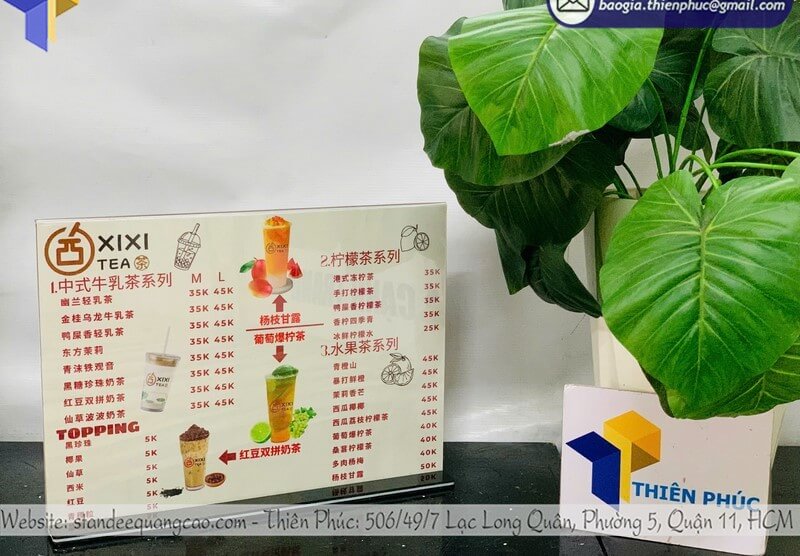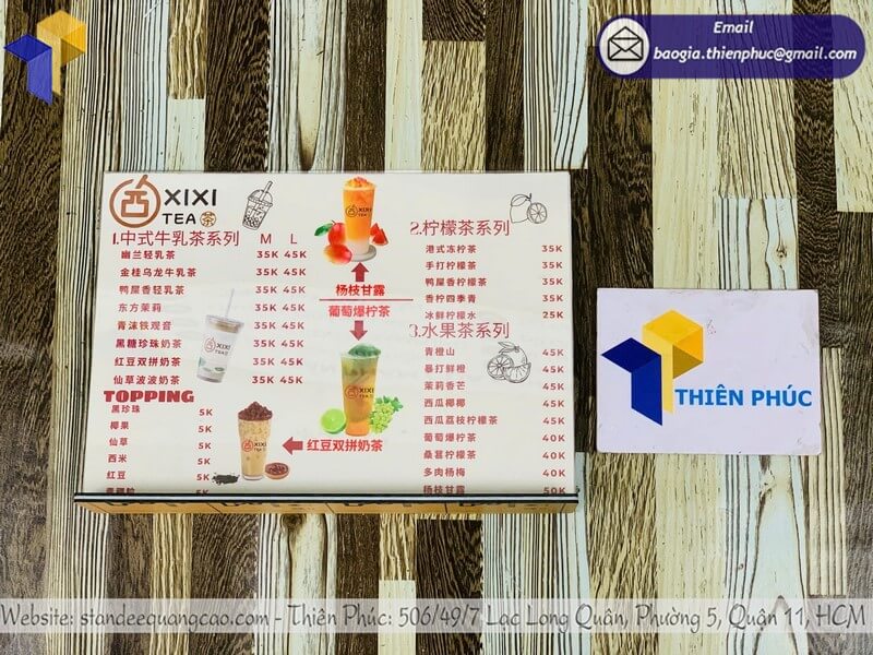 - In bìa cứng, nhựa hoặc mica, dễ thay đổi giá và món mới.