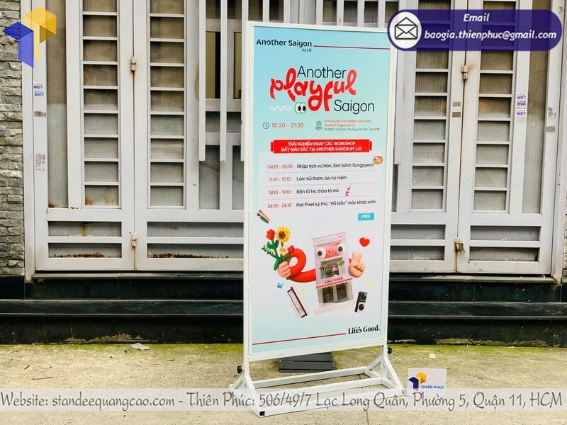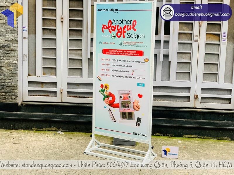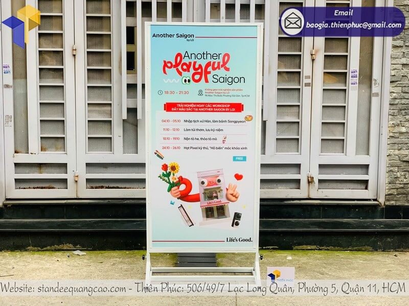 Các thương hiệu thường dùng bảng hiệu quảng cáo đứng đẹp để làm backdrop mini, giới thiệu sản phẩm hoặc thông tin chương trình. Nhờ tính linh hoạt, nó có thể được di chuyển và tái sử dụng nhiều lần.