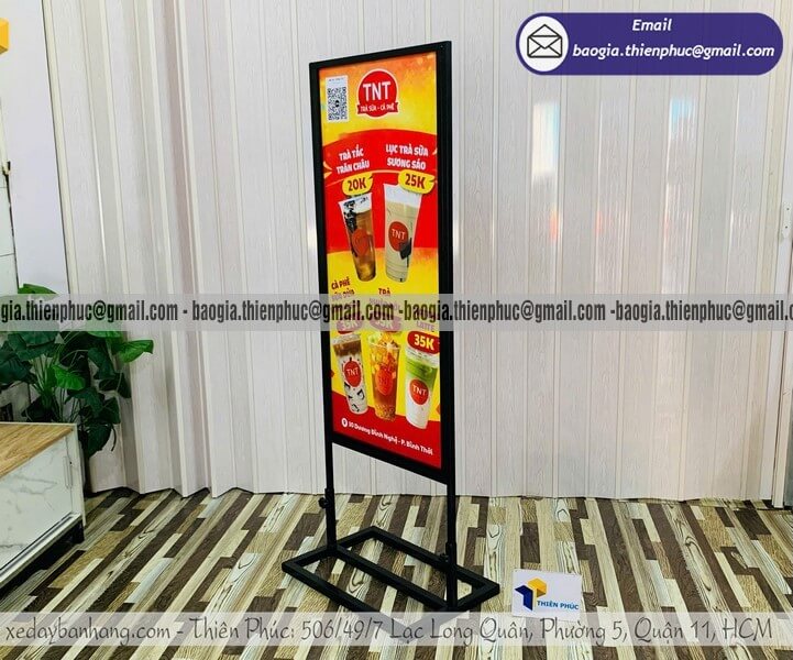 Standee khung sắt đứng 2 mặt được thiết kế với cấu trúc chắc chắn, cho phép hiển thị nội dung quảng cáo ở cả hai phía.